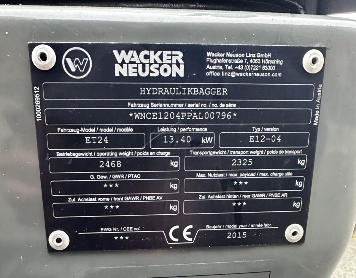 Mini-pelle Wacker Neuson ET24 VDS **Modèle :** ET24 VDS **Année :** 2015 **Certifié CE :** Oui **Heures de fonctionnement :** 380 **Poids :** 2 550 kg **Puissance :** 24 ch