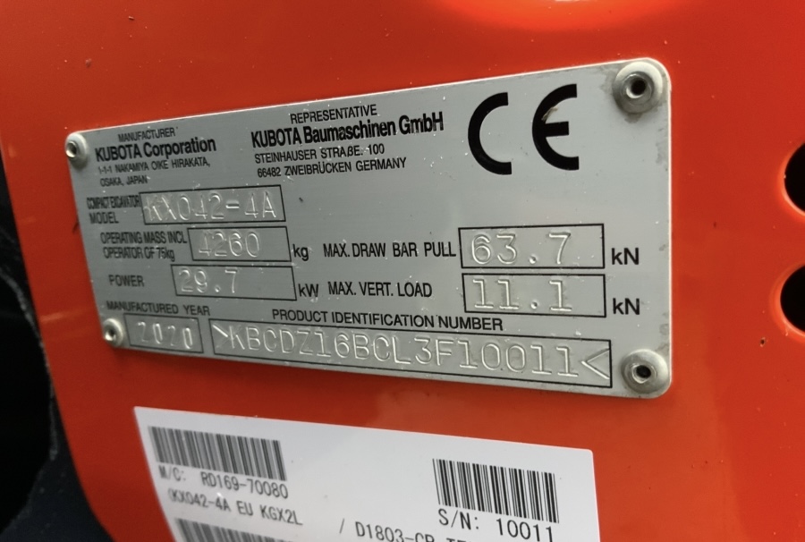 Kubota KX042-4 | 2020 | KBCDZ16BCL3F10011 | 1468 heures | 63,7 kW | Diesel |
